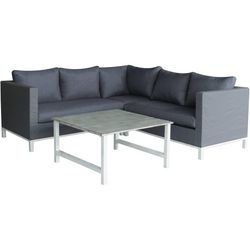 Salon de jardin - Canapé d'angle - Table basse - Structure en aluminium - Coussins assises/dossier en polyester - Déhoussables et Lavables - Résiste à la rouille - 219 x 83/219 x 70 cm - Gris.