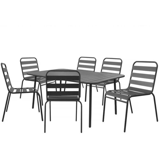 Ensemble table de jardin Bilbao - 6 places - Dimensions de la table : 150 x 90 x 71 cm - 6 chaises empilables - Dimensions des chaises : 59 x 55 x 84 cm - Métal - Gris.Salon de jardin en métal Bilbao - 6 places - Gris L'ensemble de jardin Bilbao est la solution idéale pour aménager un coin rep