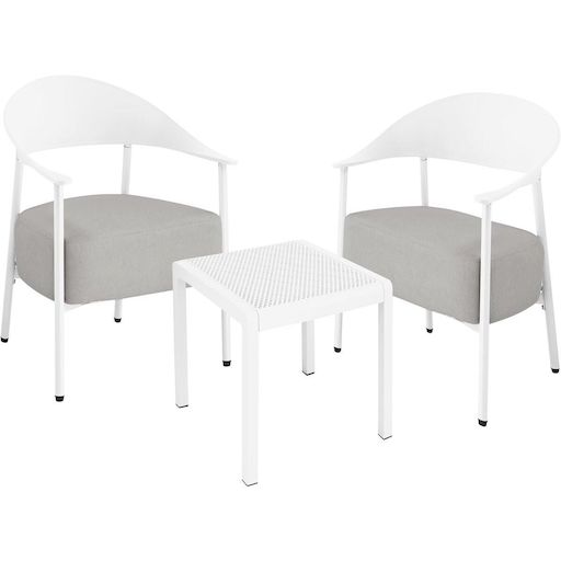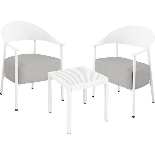 Salon de jardin Céora - 2 places Offrez à votre extérieur une ambiance moderne et conviviale avec ce salon de jardin 3 pièces alliant design et confort. Composé de deux fauteuils au style contemporain et d'une table basse assortie, cet ensemble séduit par sa structure en métal et son dossier en plastique ultra tendance, légère et facile d'entretien, idéale pour un usage en terrasse, balcon ou jardin. Les fauteuils sont équipés d'une assise en tissu avec mousse épaisse, garantissant un confort optimal même lors de longues périodes de détente. Le dossier enveloppant assure un excellent maintien, tandis que les coussins moelleux apportent une touche chaleureuse et élégante. Résistant aux conditions extérieures et simple à déplacer, cet ensemble est parfait pour créer un espace lounge pratique et esthétique. La table basse coordonnée permet d'accueillir boissons, livres ou accessoires déco, faisant de ce salon un choix idéal pour profiter pleinement de vos moments de relaxation en plein air. Ensemble de 2 fauteuils de jardin et table basse Céora - 2 places - Dimensions fauteuil: 69 x 73 x 76 cm - Dimensions Table: 50 x 50 x 38 cm - Assise en mousse épaisse 16 cm - Structure en métal et dossier en plastique .Couleurs: blanc