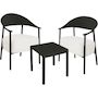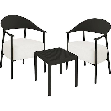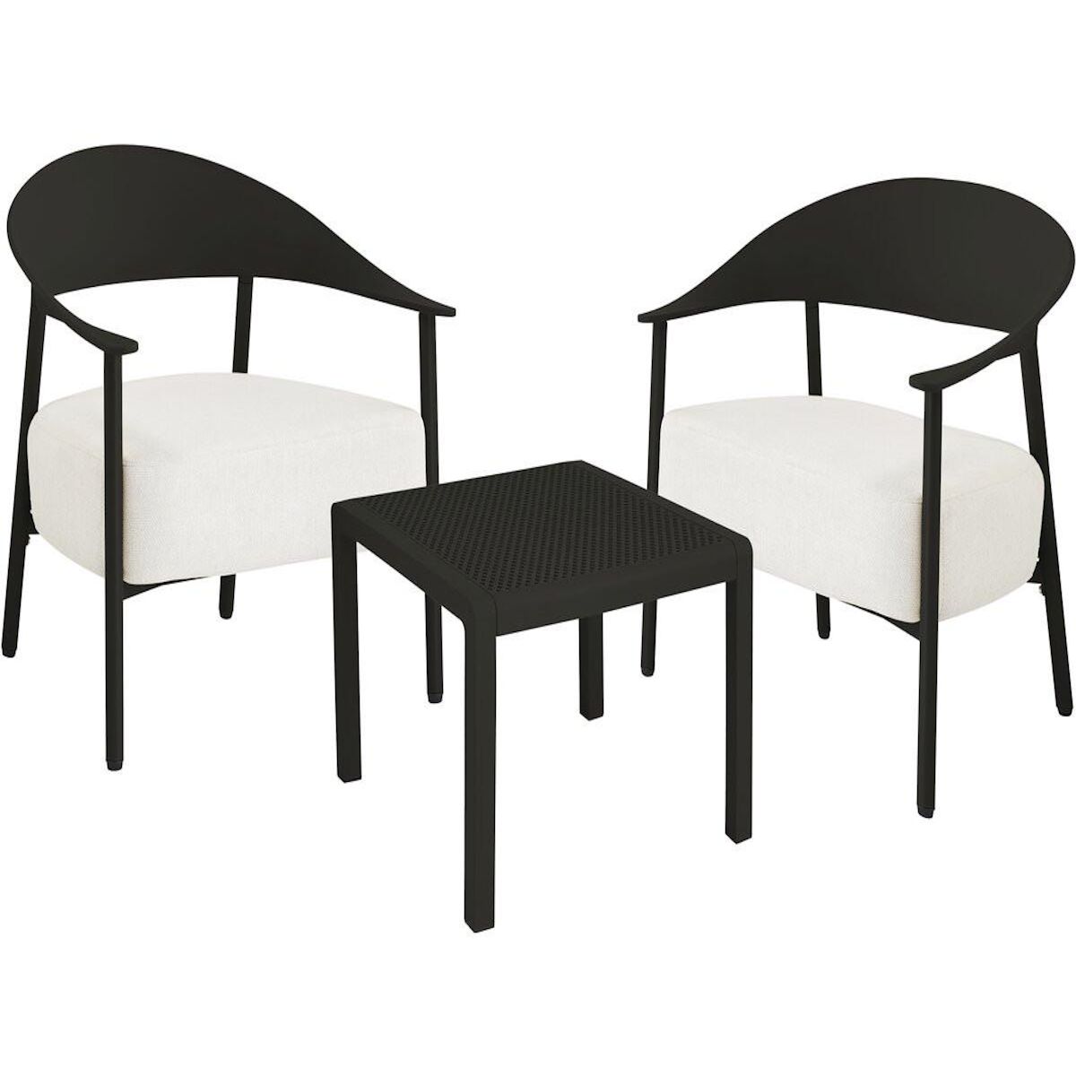 Salon de jardin Céora - 2 places Offrez à votre extérieur une ambiance moderne et conviviale avec ce salon de jardin 3 pièces alliant design et confort. Composé de deux fauteuils au style contemporain et d'une table basse assortie, cet ensemble séduit par sa structure en métal et son dossier en plastique ultra tendance, légère et facile d'entretien, idéale pour un usage en terrasse, balcon ou jardin. Les fauteuils sont équipés d'une assise en tissu avec mousse épaisse, garantissant un confort optimal même lors de longues périodes de détente. Le dossier enveloppant assure un excellent maintien, tandis que les coussins moelleux apportent une touche chaleureuse et élégante. Résistant aux conditions extérieures et simple à déplacer, cet ensemble est parfait pour créer un espace lounge pratique et esthétique. La table basse coordonnée permet d'accueillir boissons, livres ou accessoires déco, faisant de ce salon un choix idéal pour profiter pleinement de vos moments de relaxation en plein air. Ensemble de 2 fauteuils de jardin et table basse Céora - 2 places - Dimensions fauteuil: 69 x 73 x 76 cm - Dimensions Table: 50 x 50 x 38 cm - Assise en mousse épaisse 16 cm - Structure en métal et dossier en plastique .Couleurs: noir
