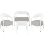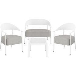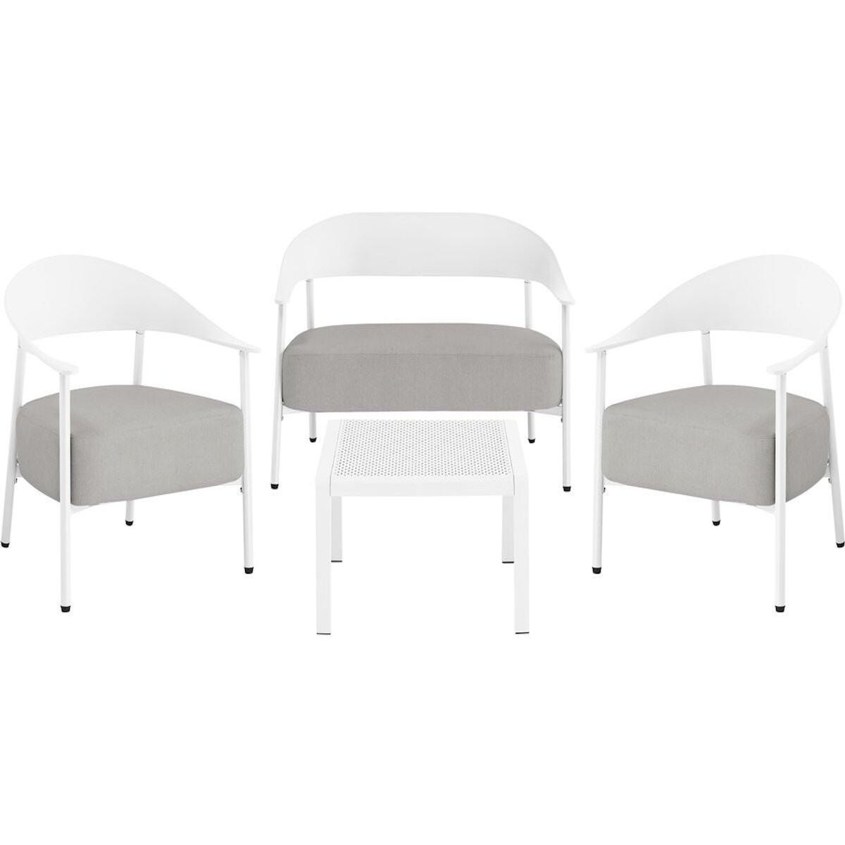 Ensemble de canapé et fauteuils de jardin Céora - 4 places - Dimensions canapé: 115 x 73 x 75 cm - Dimensions fauteuil: 69 x 73 x 76 cm - Dimensions Table: 50 x 50 x 38 cm - Structure en métal et dossier en plastique.Salon de jardin Céora - 4 places - BlancCréez un véritable espace lounge élégan