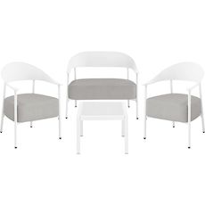 Salon de jardin Céora - 4 places - BlancCréez un véritable espace lounge élégant et confortable avec ce salon de jardin 4 pièces au design contemporain. Composé de deux fauteuils, d'un canapé 2 places et d'une table basse assortie, cet ensemble est idéal pour aménager une terrasse, un balcon ou un jardin avec style. Sa structure en métal et son dossier ultra tendance en plastique assure à la fois légèreté, résistance aux conditions extérieures et facilité d'entretien au quotidien.Les assises sont habillées d'un tissu résistant et dotées d'une mousse épaisse haute densité, offrant un confort optimal pour vos moments de détente en famille ou entre amis. Les dossiers enveloppants et les accoudoirs intégrés garantissent un excellent maintien tout en apportant une touche esthétique moderne. Ensemble de canapé et fauteuils de jardin Céora - 4 places - Dimensions canapé: 115 x 73 x 75 cm - Dimensions fauteuil: 69 x 73 x 76 cm - Dimensions Table: 50 x 50 x 38 cm - Structure en métal et dossier en plastique .Couleurs: blanc