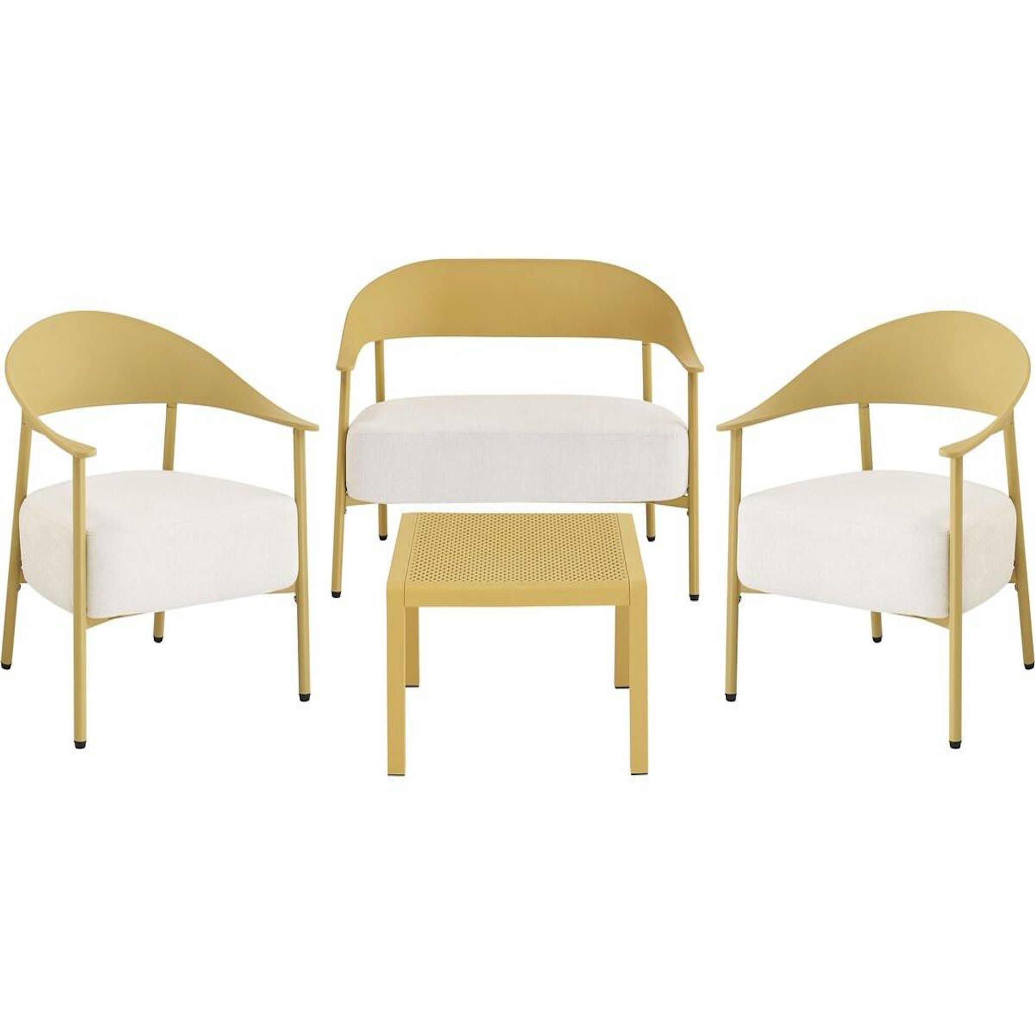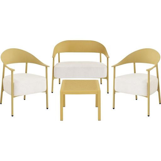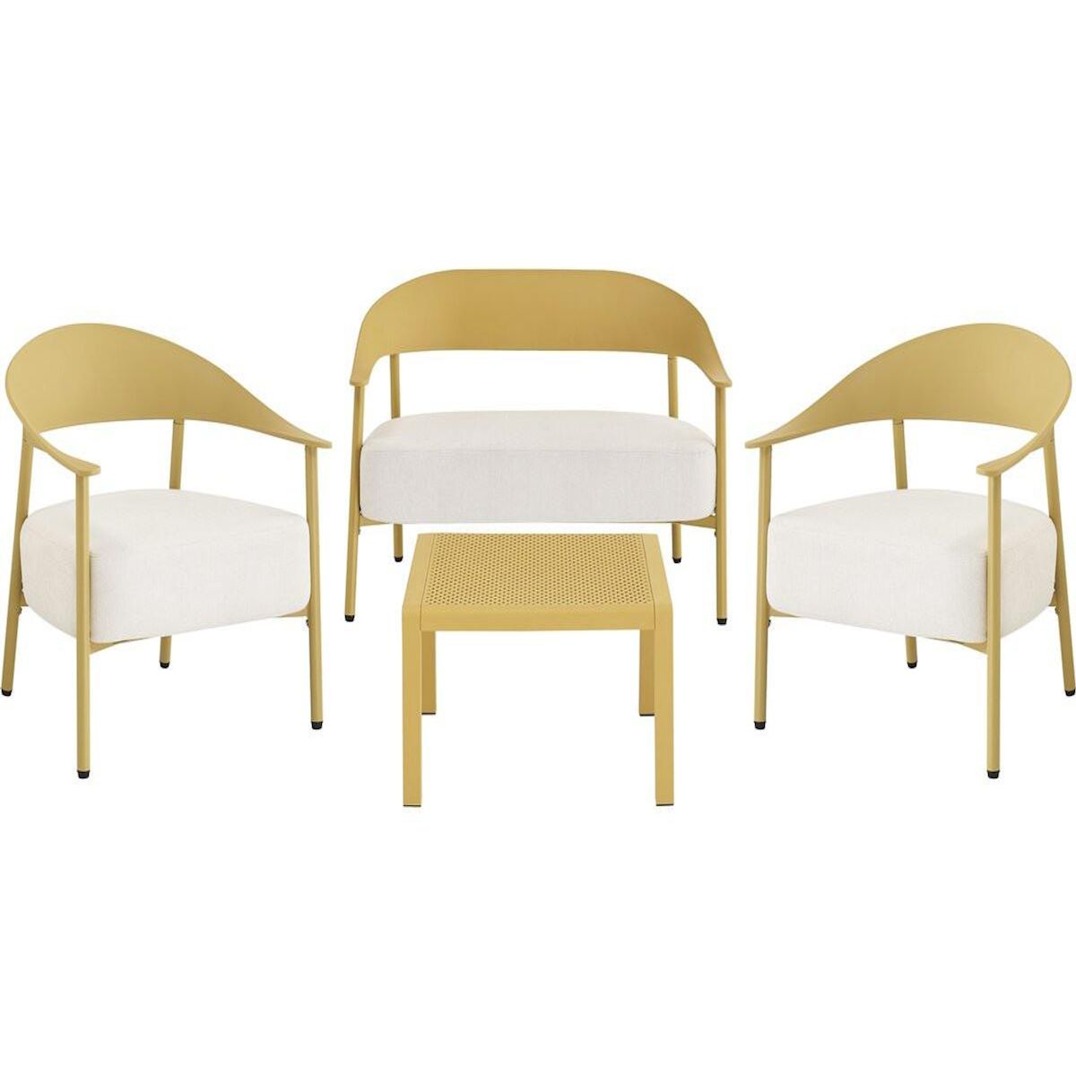 Ensemble de canapé et fauteuils de jardin Céora - 4 places - Dimensions canapé: 115 x 73 x 75 cm - Dimensions fauteuil: 69 x 73 x 76 cm - Dimensions Table: 50 x 50 x 38 cm - Structure en métal et dossier en plastique.Salon de jardin Céora - 4 places - JauneCréez un véritable espace lounge élégan