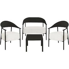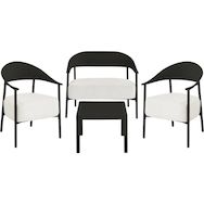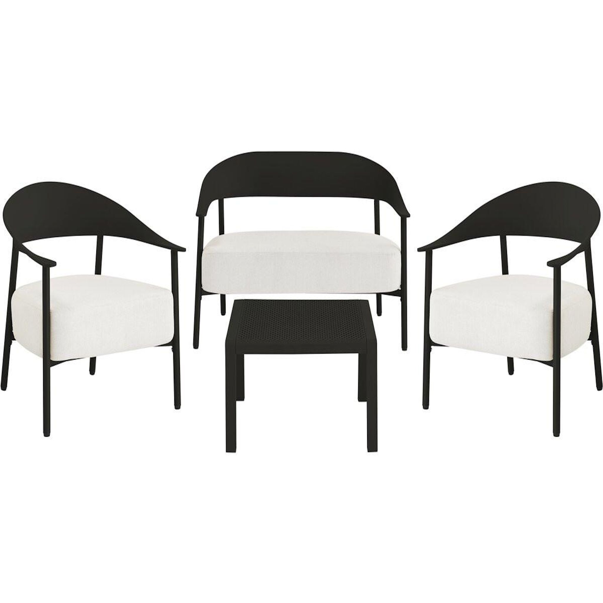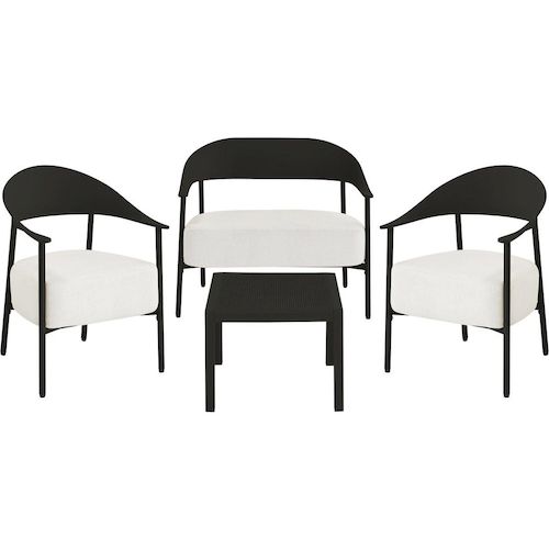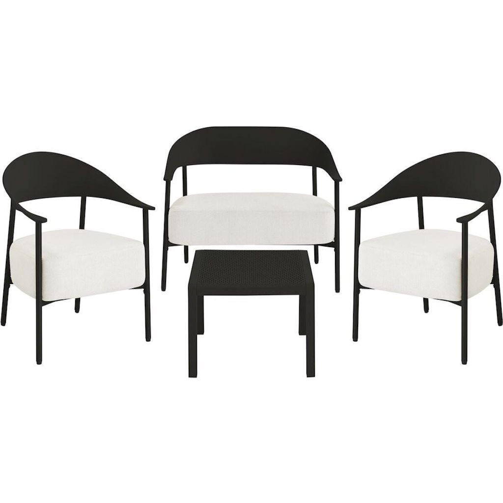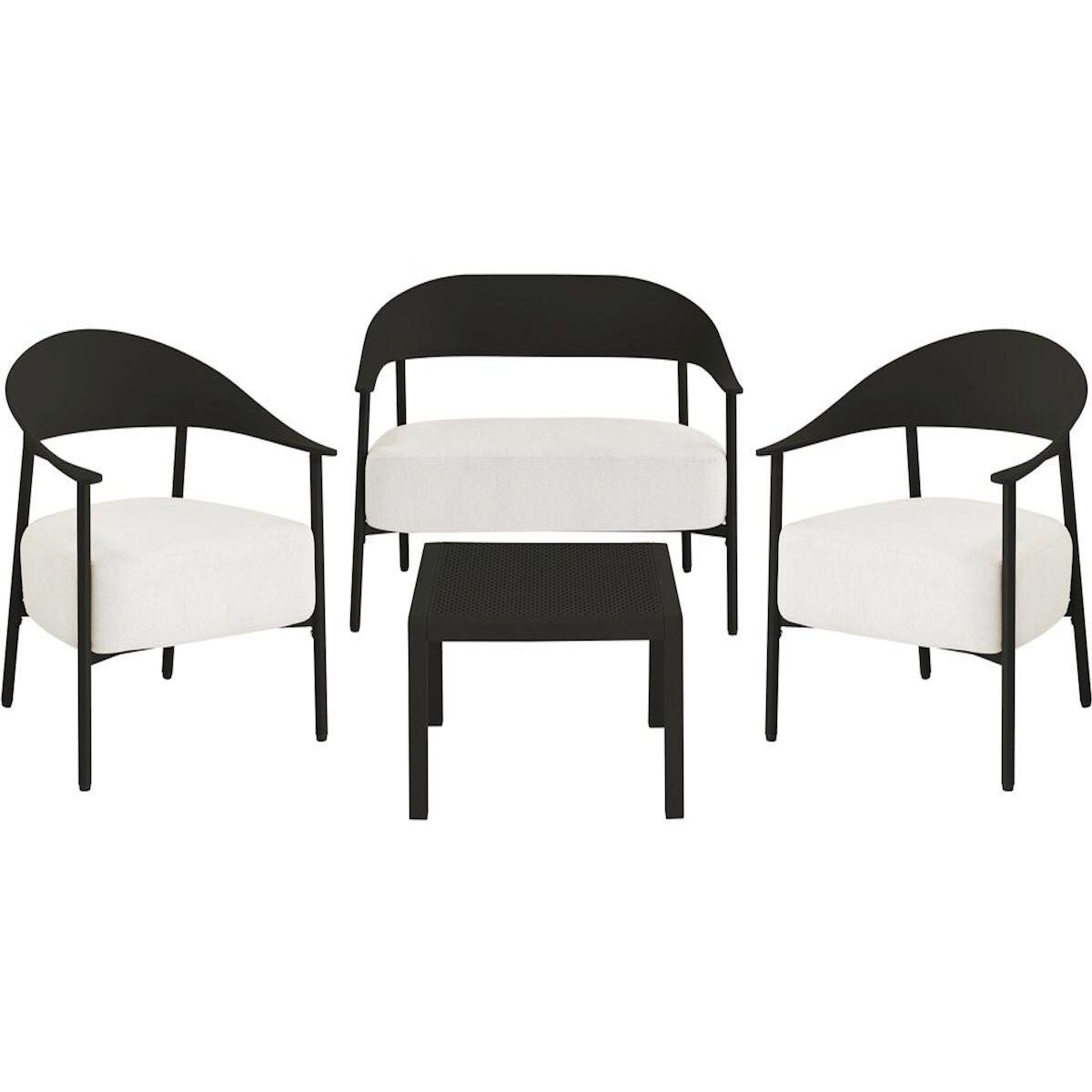 Ensemble de canapé et fauteuils de jardin Céora - 4 places - Dimensions canapé: 115 x 73 x 75 cm - Dimensions fauteuil: 69 x 73 x 76 cm - Dimensions Table: 50 x 50 x 38 cm - Structure en métal et dossier en plastique.Salon de jardin Céora - 4 places - NoirCréez un véritable espace lounge élégant
