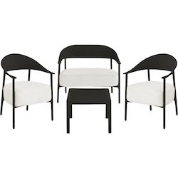 Ensemble de canapé et fauteuils de jardin Céora - 4 places - Dimensions canapé: 115 x 73 x 75 cm - Dimensions fauteuil: 69 x 73 x 76 cm - Dimensions Table: 50 x 50 x 38 cm - Structure en métal et dossier en plastique.