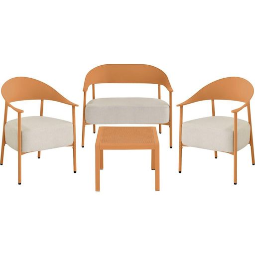 Ensemble de canapé et fauteuils de jardin Céora - 4 places - Dimensions canapé: 115 x 73 x 75 cm - Dimensions fauteuil: 69 x 73 x 76 cm - Dimensions Table: 50 x 50 x 38 cm - Structure en métal et dossier en plastique.Salon de jardin Céora - 4 places - OrangeCréez un véritable espace lounge éléga