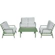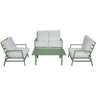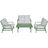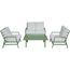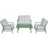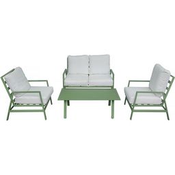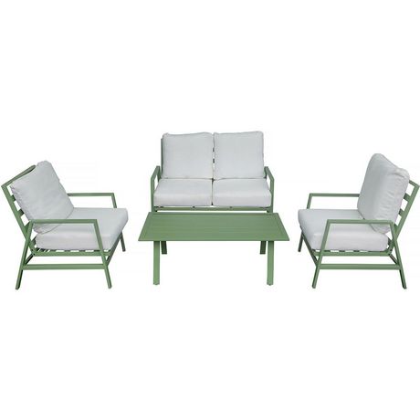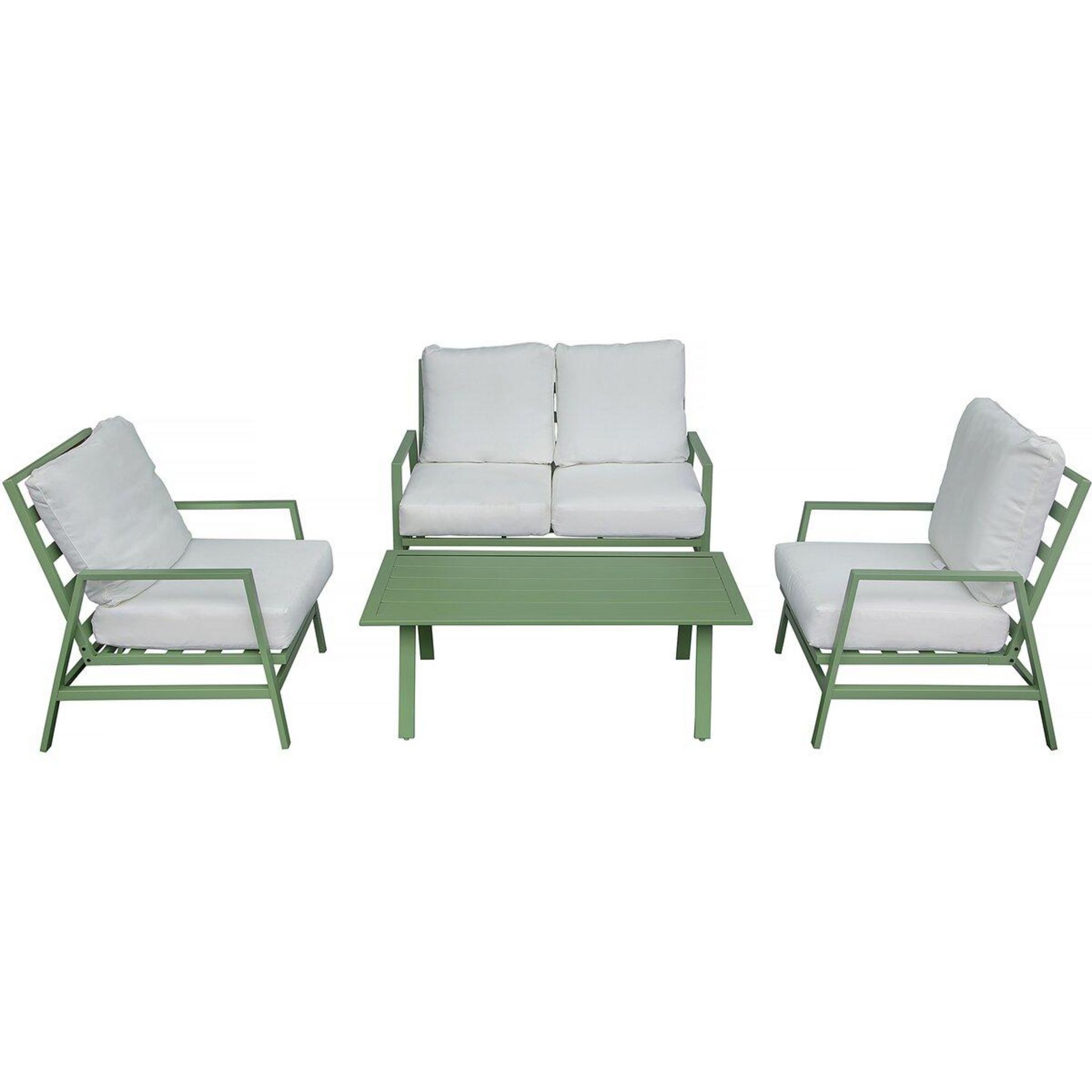 Salon d'extérieur Queens - 4 places - Dimensions chaises : 80 x 69 x 90 cm - Dimensions canapé : 80 x 130 x 90 cm - Dimensions table : 122 x 60 x 43 cm - Poids maximum supporté : 160 kg - Coussins en tissu - Couleur des coussins : Blanc - Métal - Vert.