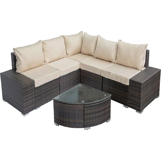 Canapé d'angle de jardin Zelda - 5 places - Dimensions canapé : 238/238 x 79 x 71 cm - Dimensions table : 70 x 70 x 35 cm - Résine tressée - Marron.