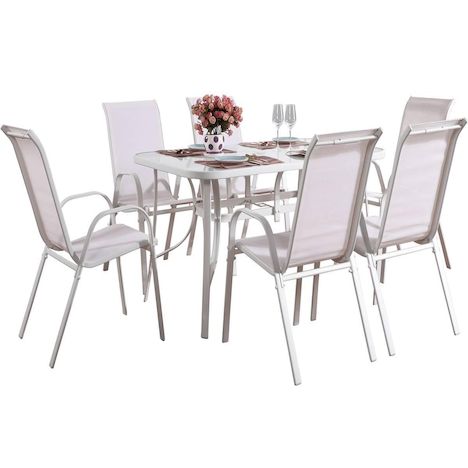 Salon de jardin en textilène Cordoba - 1 table + 6 fauteuils - 150 x 90 x 72 cm - Couleur: Ecru/Blanc .Caractéristique couleur: Salon repas de jardin, structure en acier et assise en textilène - Idéal pour recevoir vos proches et vos amis autour d'un repas.