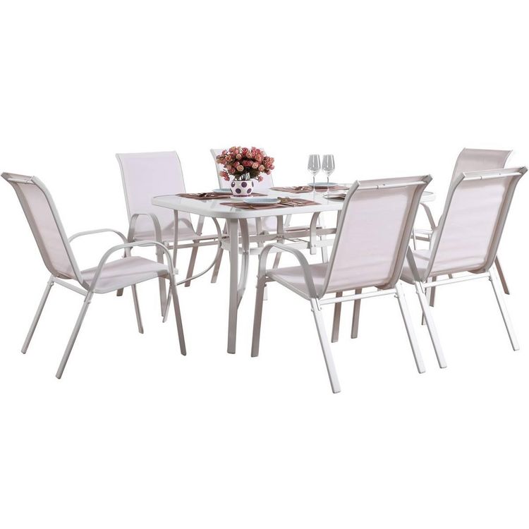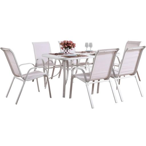Salon de jardin en textilène Cordoba - 1 table + 6 fauteuils - 150 x 90 x 72 cm - Couleur: Ecru/Blanc. : Salon repas de jardin, structure en acier et assise en textilène - Idéal pour recevoir vos proches et vos amis autour d'un repas. Ce salon se veut moderne, fonctionnel mais surtout convivial. L