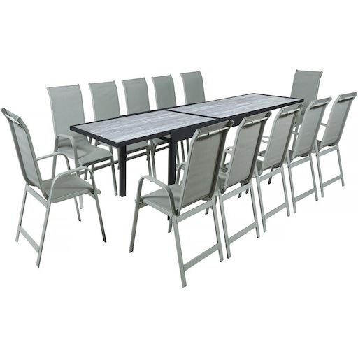 Salon de jardin Lagos - 200/320 x 105 x 76 cm - Taupe - 12 places : Le salon de jardin Lagos est l'allié parfait pour des repas conviviaux en famille ou entre amis. Conçu pour offrir à la fois praticité et durabilité, cet ensemble s'adapte à toutes vos envies grâce à sa table extensible et ses 12 chaises confortables.Sa structure en aluminium, à la fois robuste et légère, assure une excellente durabilité en extérieur. Grâce à son mécanisme extensible, la table passe de 200 à 320 cm, offrant un espace généreux pour recevoir vos invités en toute convivialité. Son design épuré et son coloris intemporel s'adaptent à tous les styles d'aménagement.Avec leurs dimensions généreuses, 75.5 x 55.5 x 99 cm, les chaises allient confort et solidité. Conçus pour résister aux UV, à la rouille et aux intempéries, elles assurent une longue tenue dans le temps. Avec le salon de jardin Lagos , transformez votre terrasse ou jardin en un espace chaleureux et raffiné, prêt à accueillir tous vos moments de partage. Salon de jardin extensible - 1 table repas de jardin en aluminium extensible - Dimensions : 200/320 x 105 x 76 cm - gris - Lot de 2 fauteuils de jardin - 57.5 x 62 x 90 cm - Taupe .Caractéristique couleur: Salon d'extérieur Lagos - Dimensions table : 200/320 x 105 x 76 cm - Fonction extensible - Effet marbre - Traitement anti-UV et anti rouille - Aluminium - 12 chaises - Taupe.
