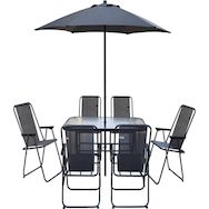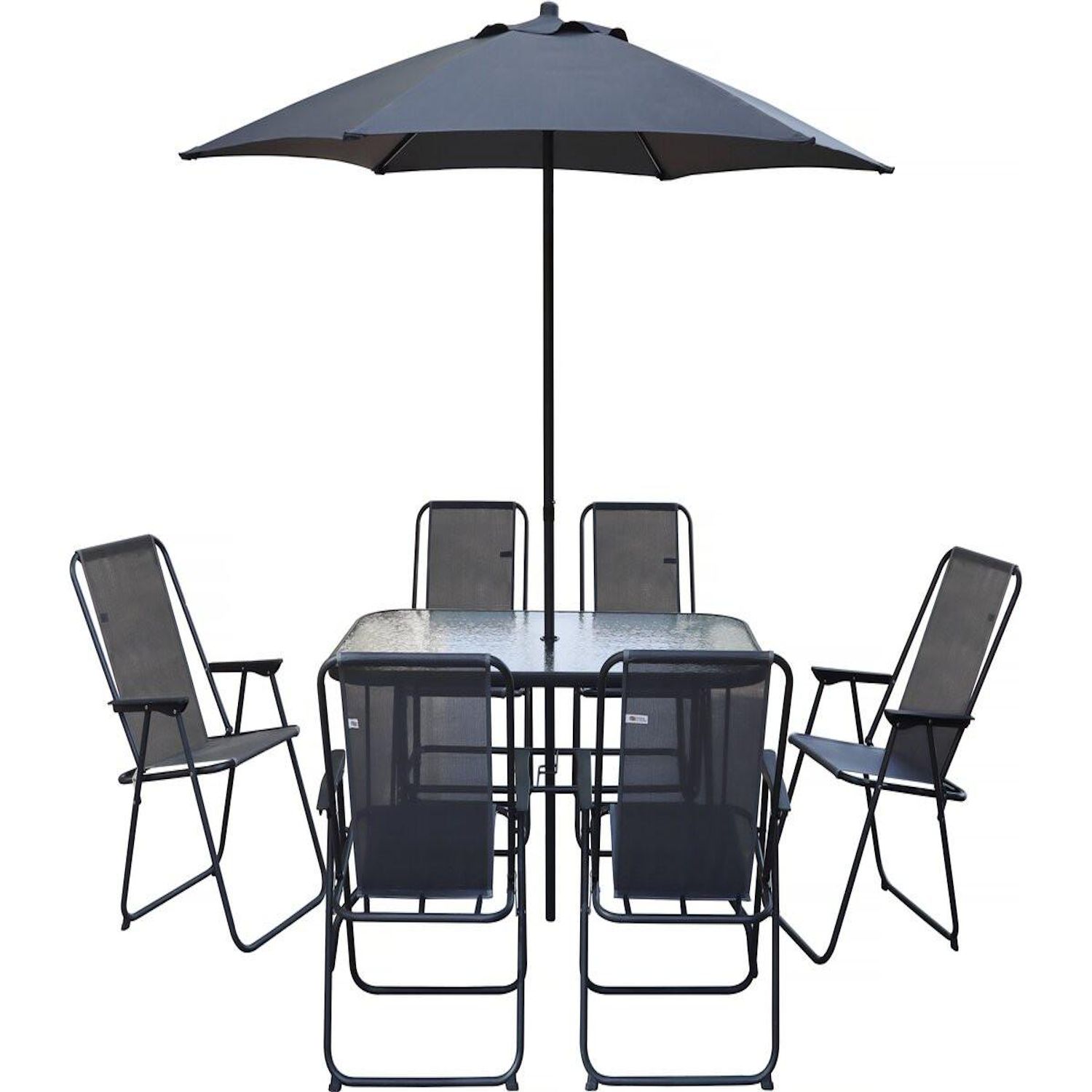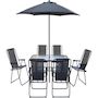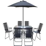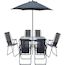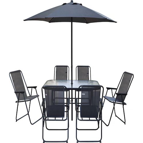 Ensemble table et chaises + parasol Convivia - 6 places - Dimensions chaises : 53 x 67 x 89 cm - Dimensions parasol : 180 x 180 x 220 cm - Dimensions table : 130 x 80 x 70 cm - Métal - Table avec verre trempé - Gris anthracite.