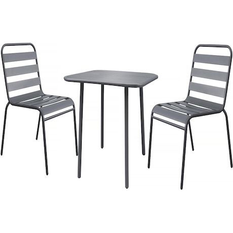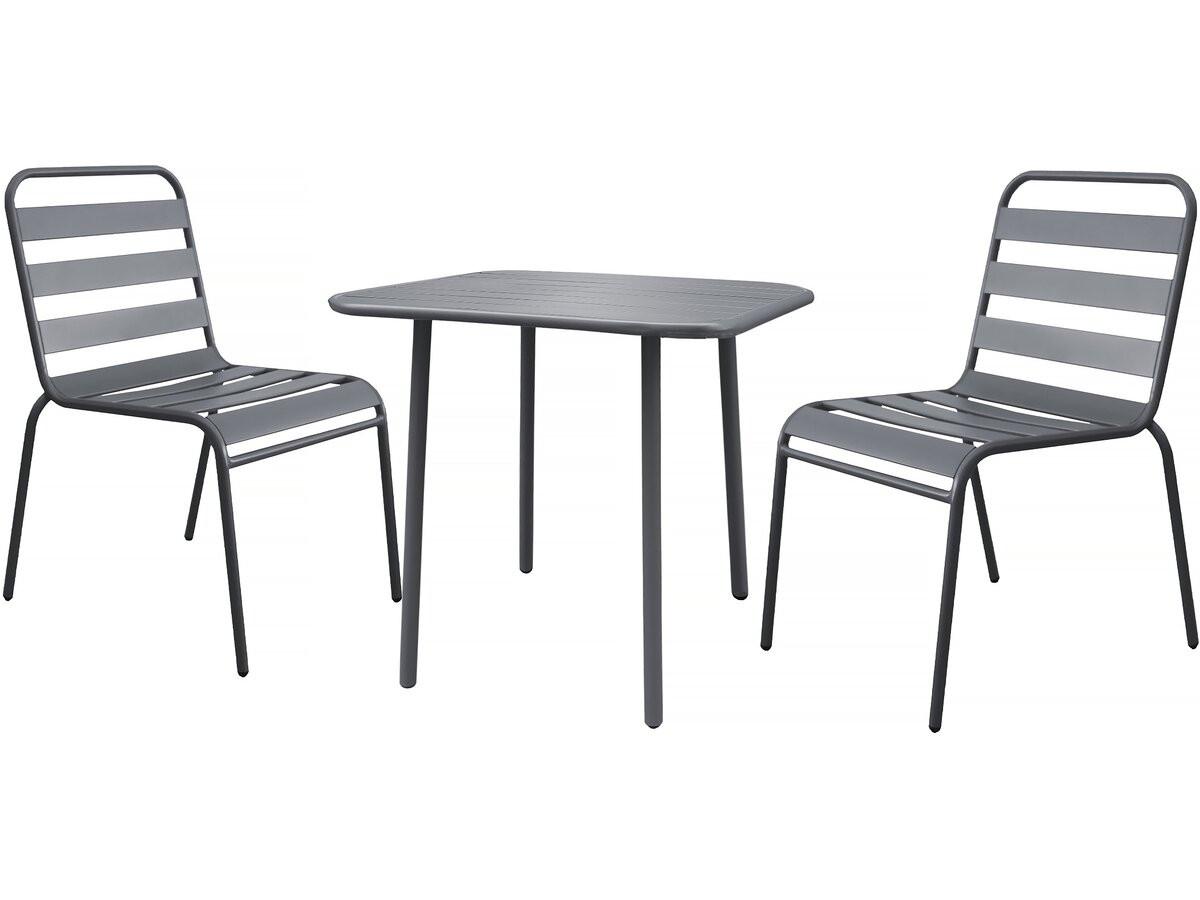 Salon de jardin en métal Bilbao - 2 places - GrisL'ensemble de jardin Bilbao est la solution idéale pour aménager un coin repas et détente à la fois pratique et convivial en extérieur. Composé d'une table spacieuse et de chaises, cet ensemble peut accueillir jusqu'à 2 personnes, parfait pour vos repas en famille ou vos moments de partage entre amis.Avec ses dimensions compactes, 70 x 70 x 71 cm, la table offre un espace pratique pour profiter de vos repas en plein air. Son design épuré et ses coins arrondis allient simplicité et sécurité, tandis que sa structure en métal robuste assure une solidité à toute épreuve et une excellente résistance aux intempéries, pour une utilisation durable en extérieur.Pour compléter l'ensemble, les chaises Bilbao , 59 x 55 x 84 cm, au design assorti et conçues en métal de haute qualité sont parfaitement adaptées pour être laissées en extérieur toute l'année. Avec son coloris gris, cet ensemble s'intègre harmonieusement dans tous les types d'espaces extérieurs.N'attendez plus pour transformer votre extérieur avec l'ensemble Bilbao et profitez pleinement de vos moments en plein air ! Ensemble table de jardin Bilbao - 2 places - Dimensions de la table : 70 x 70 x 71 cm - 2 chaises empilables - Dimensions des chaises : 59 x 55 x 84 cm - Métal - Gris .Couleurs: Gris