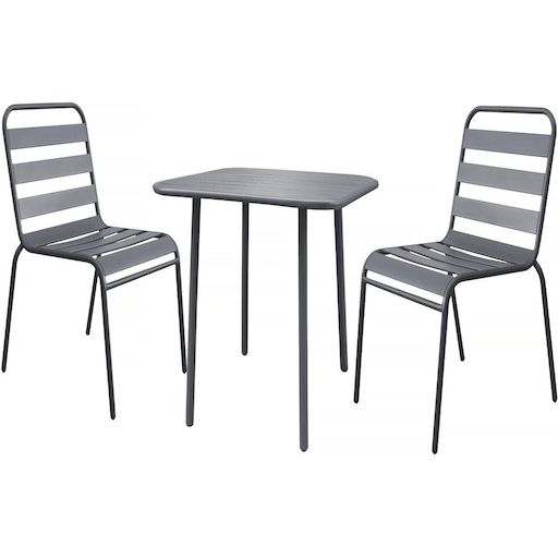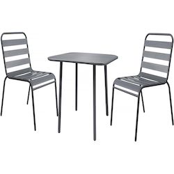Ensemble table de jardin Bilbao - 2 places - Dimensions de la table : 70 x 70 x 71 cm - 2 chaises empilables - Dimensions des chaises : 59 x 55 x 84 cm - Métal - Gris.Salon de jardin en métal Bilbao - 2 places - GrisL'ensemble de jardin Bilbao est la solution idéale pour aménager un coin repas