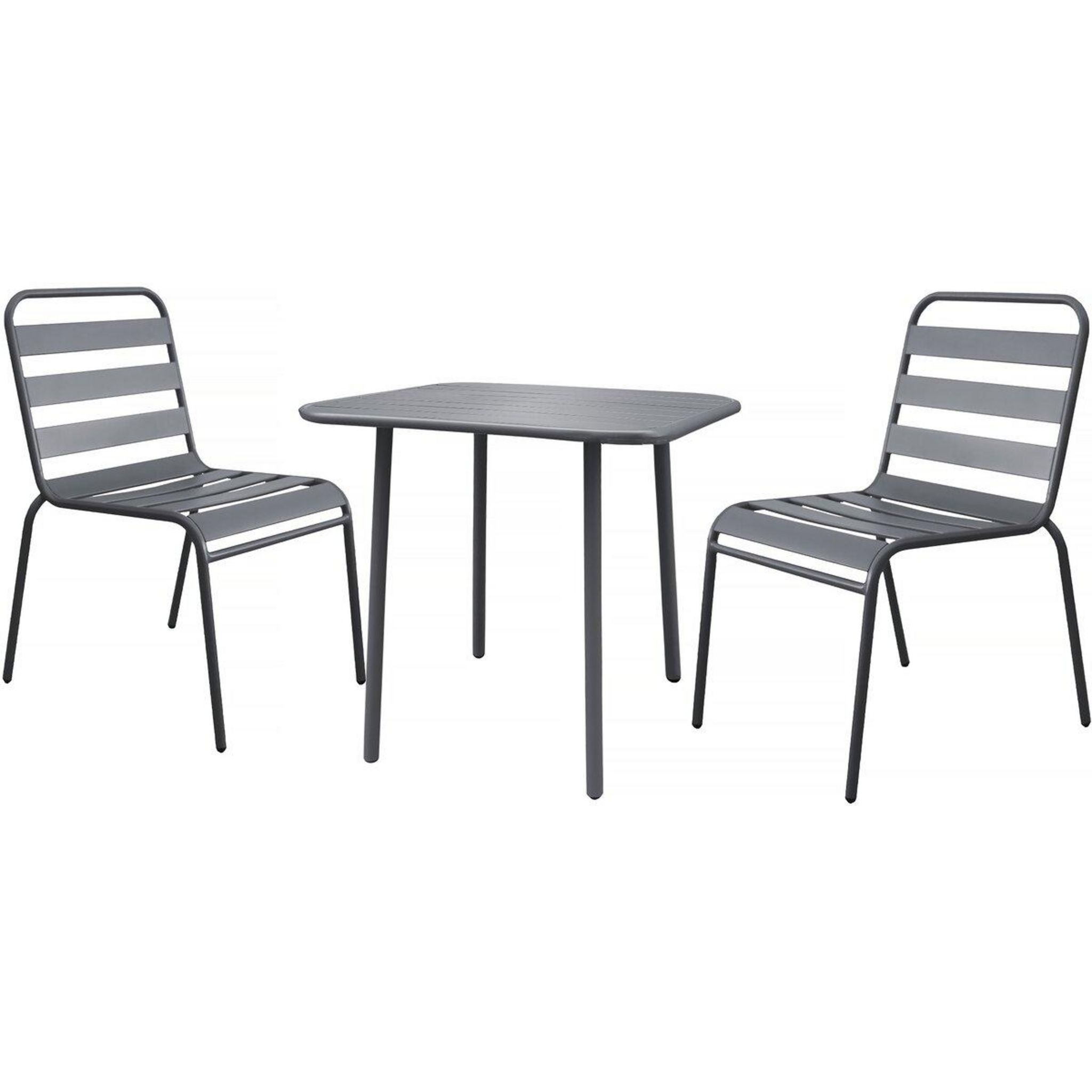 Ensemble table de jardin Bilbao - 2 places - Dimensions de la table : 70 x 70 x 71 cm - 2 chaises empilables - Dimensions des chaises : 59 x 55 x 84 cm - Métal - Gris.