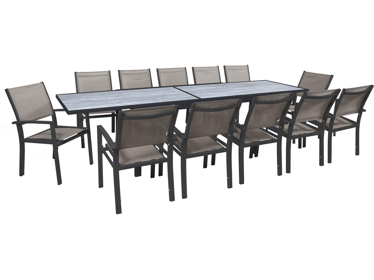 Salon de jardin Lagos - 200/320 x 105 x 76 cm - Taupe - 12 places : Le salon de jardin Lagos est l'allié parfait pour des repas conviviaux en famille ou entre amis. Conçu pour offrir à la fois praticité et durabilité, cet ensemble s'adapte à toutes vos envies grâce à sa table extensible et ses 12 chaises confortables.Sa structure en aluminium, à la fois robuste et légère, assure une excellente durabilité en extérieur. Grâce à son mécanisme extensible, la table passe de 200 à 320 cm, offrant un espace généreux pour recevoir vos invités en toute convivialité. Son design épuré et son coloris noir intemporel s'adaptent à tous les styles d'aménagement.Avec leurs dimensions généreuses, 57.5 x 62 x 90 cm, les chaises allient confort et solidité. Conçus pour résister aux UV, à la rouille et aux intempéries, elles assurent une longue tenue dans le temps. Avec le salon de jardin Lagos , transformez votre terrasse ou jardin en un espace chaleureux et raffiné, prêt à accueillir tous vos moments de partage. Ensemble table et chaises de jardin - repas de jardin en aluminium extensible - Dimensions : 200/320 x 105 x 76 cm - Gris - Fauteuils de jardin 57.5 x 62 x 90 cm - taupe. .Descriptif: Salon d'extérieur Lagos - Dimensions table : 200/320 x 105 x 76 cm - Fonction extensible - Effet marbre - Traitement anti-UV et anti rouille - Aluminium - Métal - 12 chaises - Dimensions chaises : 57.5 x 62 x 90 cm