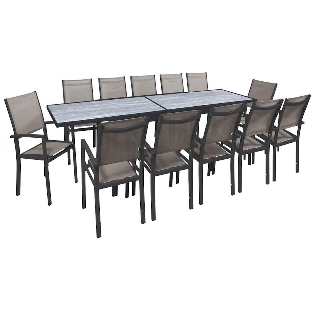 Ensemble table et chaises de jardin - repas de jardin en aluminium extensible - Dimensions : 200/320 x 105 x 76 cm - Gris - Fauteuils de jardin 57.5 x 62 x 90 cm - taupe..Salon de jardin Lagos - 200/320 x 105 x 76 cm - Taupe - 12 places : Le salon de jardin Lagos est l'allié parfait pour des