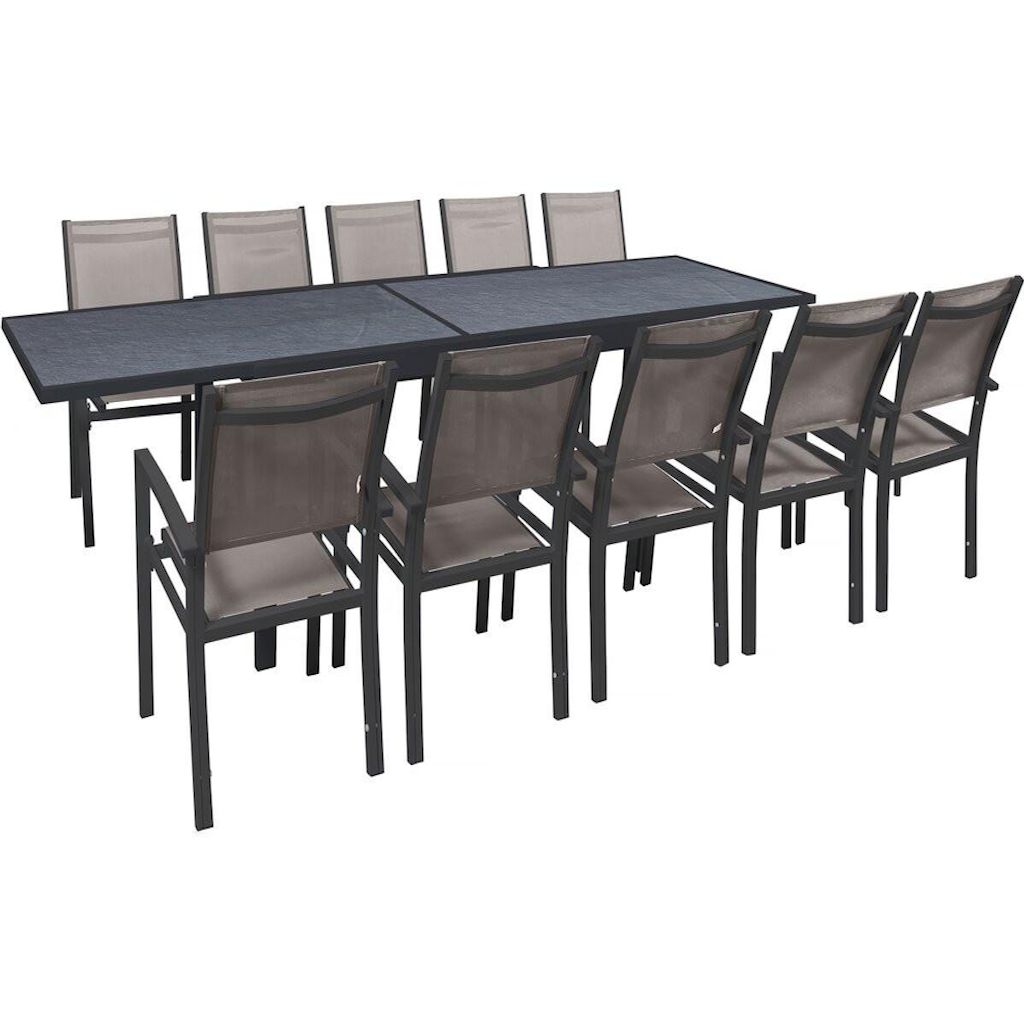 Salon d'extérieur Lagos - Dimensions table : 200/320 x 105 x 76 cm - Fonction extensible - Effet marbre - Traitement anti-UV et anti rouille - Aluminium - 10 chaises - Dimensions chaises : 57.5 x 62 x 90 cm - Taupe.Salon de jardin Lagos - 200/320 x 105 x 76 cm - 10 chaises - TaupeLe salon de jar