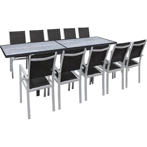 Salon de jardin Lagos - Table extensible 200/320 x 105 x 76 cm - 10 chaises - NoirLe salon de jardin Lagos est l'allié parfait pour des repas conviviaux en famille ou entre amis. Conçu pour offrir à la fois praticité et durabilité, cet ensemble s'adapte à toutes vos envies grâce à sa table extensible et ses 10 chaises confortables.Sa structure en aluminium, à la fois robuste et légère, assure une excellente durabilité en extérieur. Grâce à son mécanisme extensible, la table passe de 200 à 320 cm, offrant un espace généreux pour recevoir vos invités en toute convivialité. Son design épuré et son coloris noir intemporel s'adaptent à tous les styles d'aménagement.Avec leurs dimensions généreuses, 57.5 x 62 x 90 cm, les chaises allient confort et solidité. Conçus pour résister aux UV, à la rouille et aux intempéries, elles assurent une longue tenue dans le temps. Avec le salon de jardin Lagos , transformez votre terrasse ou jardin en un espace chaleureux et raffiné, prêt à accueillir tous vos moments de partage. Ensemble table et chaises de jardin Lagos - Dimensions table : 200/320 x 105 x 76 cm - Fonction extensible - Effet marbre - Aluminium - Métal - 10 chaises - Dimensions chaises : 57.5 x 62 x 90 cm - Noir .Caractéristique couleur: Salon d'extérieur Lagos - Dimensions table : 200/320 x 105 x 76 cm - Fonction extensible - Effet marbre - Traitement anti-UV et anti rouille - Aluminium - Métal - 10 chaises - Dimensions chaises : 57.5 x 62 x 90 cm - Non empilable - Noir