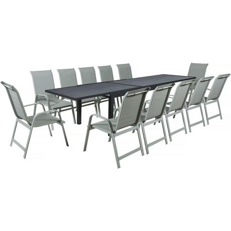 Salon d'extérieur Lagos - Dimensions table : 200/320 x 105 x 76 cm - Fonction extensible - Effet marbre - Traitement anti-UV et anti rouille - Aluminium - 12 chaises - Dimensions chaises : 57.5 x 62 x 90 cm - Non empilable - Gris clair.