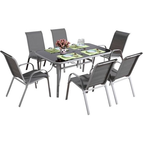 Salon de jardin en textilène Cordoba + Porto 6 places Table acier/plateau verre 150x90x72cm - 6 sièges textilène gris clair/structure argent 75.5x55.5x99cm - Sièges non empilables. : Salon repas de jardin, structure en acier et assise en textilène - Idéal pour recevoir vos proches et vos amis auto