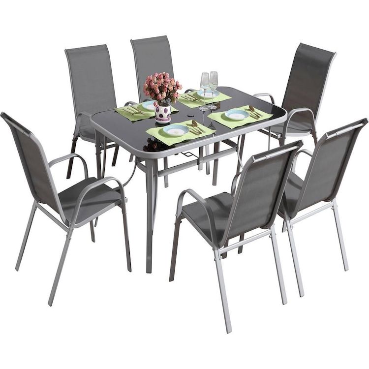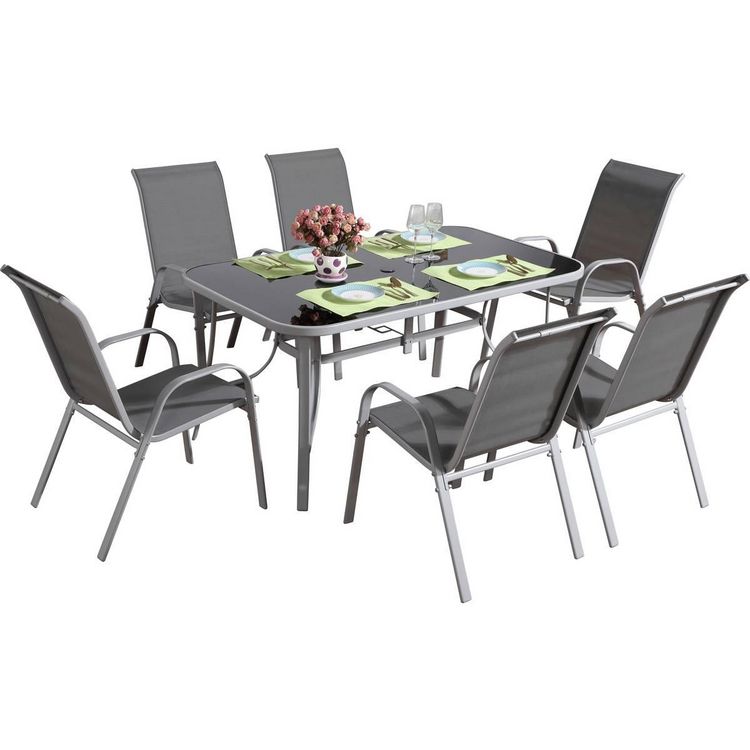 Salon de jardin en textilène Cordoba + Porto 6 places Table acier/plateau verre 150x90x72cm - 6 sièges textilène gris clair/structure argent 75.5x55.5x99cm - Sièges non empilables.