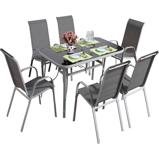Salon de jardin en textilène Cordoba + Porto 6 places Table acier/plateau verre 150x90x72cm - 6 sièges textilène gris clair/structure argent 75.5x55.5x99cm - Sièges non empilables .Caractéristique couleur: Salon repas de jardin, structure en acier et assise en textilène - Idéal pour recevoir vos proches et vos amis autour d'un repas.
