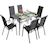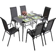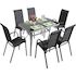 Salon de jardin en textilène Cordoba + Porto 6 places - Table acier/plateau verre 150x90x72cm - 6 sièges textilène gris foncé/structure argent 75.5x55.5x99cm - Sièges non empilables.