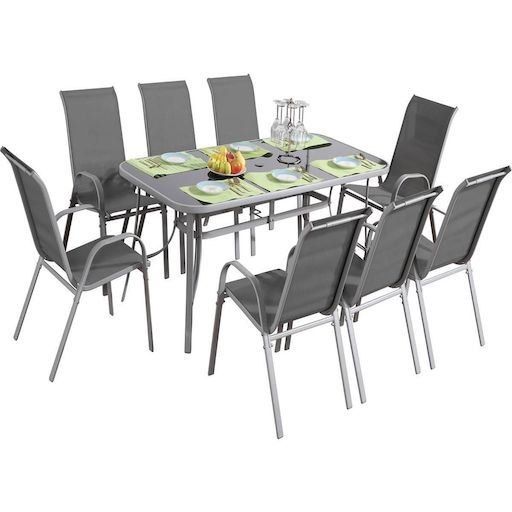 En savoir +Salon de jardin en textilène Cordoba + Porto 8 places - Table acier/plateau verre 180x90x72cm - 8 sièges textilène gris clair/structure argent 75.5x55.5x99cm - Sièges non empilables.