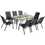 : Salon repas de jardin, structure en acier et assise en textilène - Idéal pour recevoir vos proches et vos amis autour d'un repas. Ce salon se veut moderne, fonctionnel mais surtout convivial. L'idée est de vous proposer un produit avec lequel vous aurez envie de profiter, confortablement, de votre jardin. Par ailleurs, parce que l'aspect esthétique a également de l'importance, nous avons voulu vous présenter un salon repas au design étudié et moderne qui répond aux nouvelles tendances du mobilier de jardin. En fonction de vos goûts, celui-ci s'adaptera facilement et avec harmonie à votre jardin.
