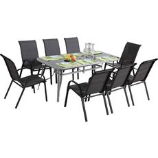 Salon de jardin en textilène Cordoba + Porto 8 places - Table acier/plateau verre 180x90x72cm - 8 sièges textilène gris foncé/structure argent 75.5x55.5x99cm - Sièges non empilables.