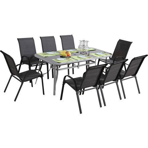 Salon de jardin en textilène Cordoba + Porto 8 places - Table acier/plateau verre 180x90x72cm - 8 sièges textilène gris foncé/structure argent 75.5x55.5x99cm - Sièges non empilables. : Salon repas de jardin, structure en acier et assise en textilène - Idéal pour recevoir vos proches et vos amis au