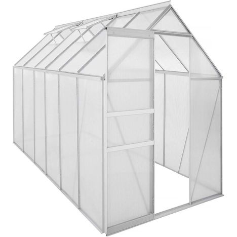 Serre jardin en aluminium et polycarbonate Basilic - Dimensions : 370 x 190 x 195 cm - Surface : 7,03 m² - 4 fenêtres et 1 porte coulissante - Structure en aluminium grise - Epaisseur - 0.8 mm.