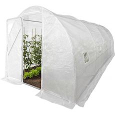 Serre en polypropylène Mimosa - 18 m² - 180g - Blanc - Dimensions : 600 x 300 x 200 cm - Système d'ouverture avec porte à gauche et vers l'extérieur - 8 fenêtres.