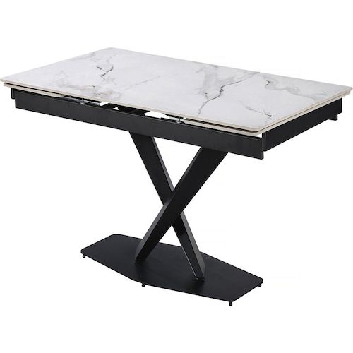 Table repas de salle manger en céramique Silence - Extensible - Blanc marbré gris - Dimensions: 160/240 x 90 x 76 cm - Pieds en métal noir.