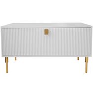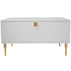 Table basse Dorset - 120 x 51 x 55 cm - BlancheLa table basse Dorset est l'addition parfaite à votre salon moderne. Mesurant 120 x 51 x 55 cm, cette table basse offre amplement d'espace pour vos magazines, votre télécommande et autres accessoires de salon. Avec sa finition blanche élégante et ses pieds dorés, cette table basse ajoutera une touche de sophistication à votre décoration intérieure.Conçue avec deux rangements spacieux, cette table basse offre un espace de rangement supplémentaire pour vos livres et autres objets précieux, tout en étant facilement accessible. Les pieds dorés de cette table basse offrent une stabilité optimale, tandis que sa construction de haute qualité garantit une durabilité à long terme.La table basse Dorset est également facile à assembler et à nettoyer, ce qui en fait un choix pratique pour tout salon. Cette table basse est conçue pour les maisons modernes, offrant une touche de sophistication à tout espace de vie.Commandez dès maintenant la table basse Dorset et profitez d'une expérience de salon pratique et élégante. Ajoutez cette pièce élégante à votre salon dès maintenant ! Table basse Dorset - Rectangulaire - 120 x 51 x 55 cm - 2 rangements - Pieds en métal doré : 20 cm - Ouverture des portes grâce à un vérin hydraulique .Descriptif: Table basse 120 Dorset 05 - Rectangulaire - 120 x 51 x 55 cm - 2 niches - Blanc