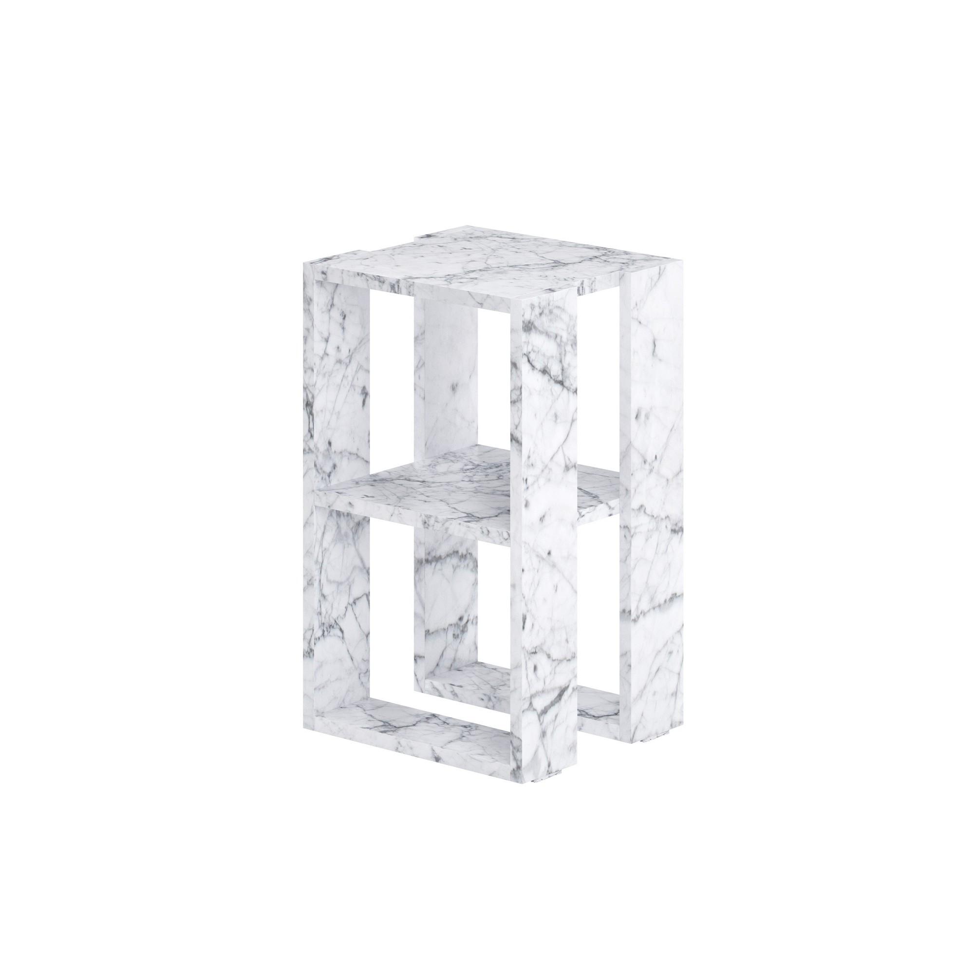 Table de chevet moderne à 2 niveaux, couleur marbre de Carrare, 30 x 55 x 30 cm, panneaux de particules mélaminés, épaisseur : 18 mm. Élégante et fonctionnelle, elle est idéale pour la chambre ou le salon..