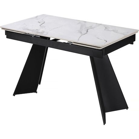 Table repas de salle manger en céramique extensible Equinoxe - Blanc marbré gris - Dimensions: 240 x 90 x 76 cm - Pieds en métal noir.