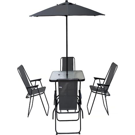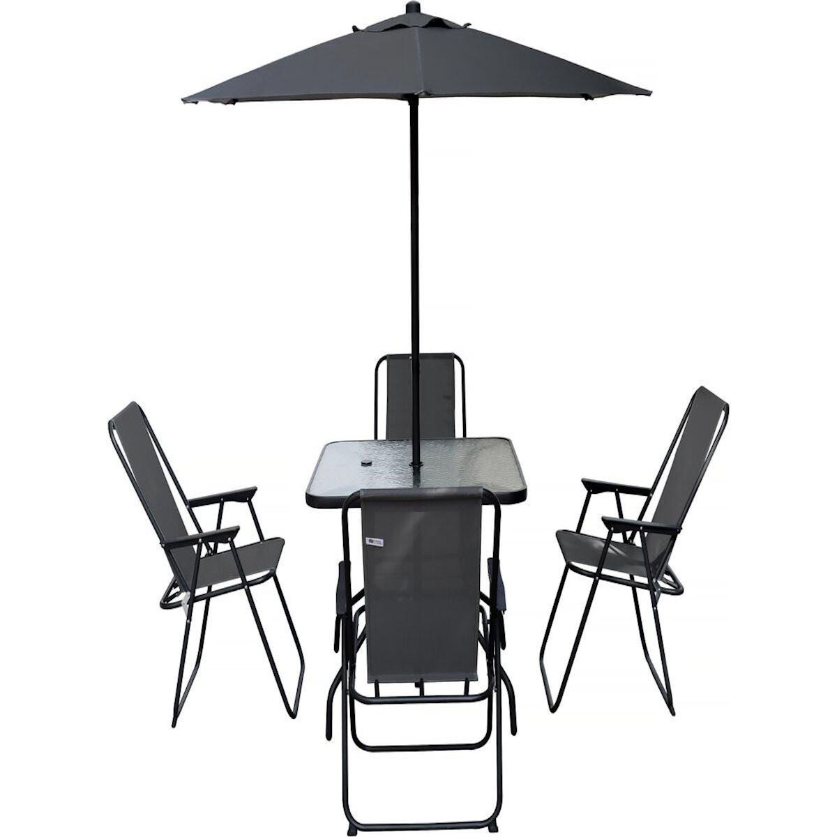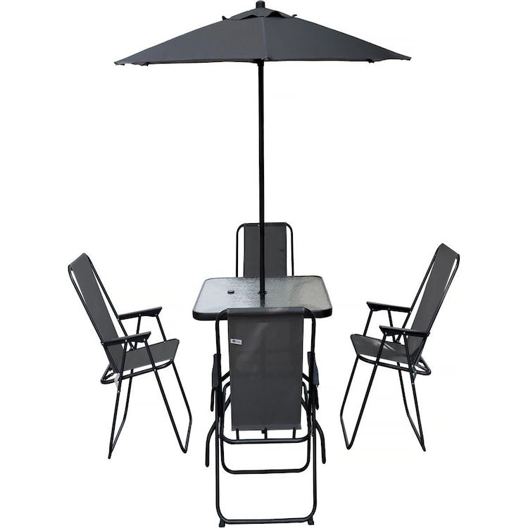 Salon de jardin Convivia - 4 places - Dimensions chaises : 53 x 67 x 89 cm - Dimension parasol : 180 x 180 x 220 cm - Dimensions table : 80 x 80 x 70 cm - Parasol inclus - Métal - Table avec verre trempé - Epaisseur 5 mm - Gris anthracite.