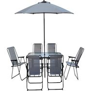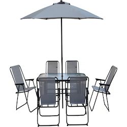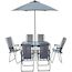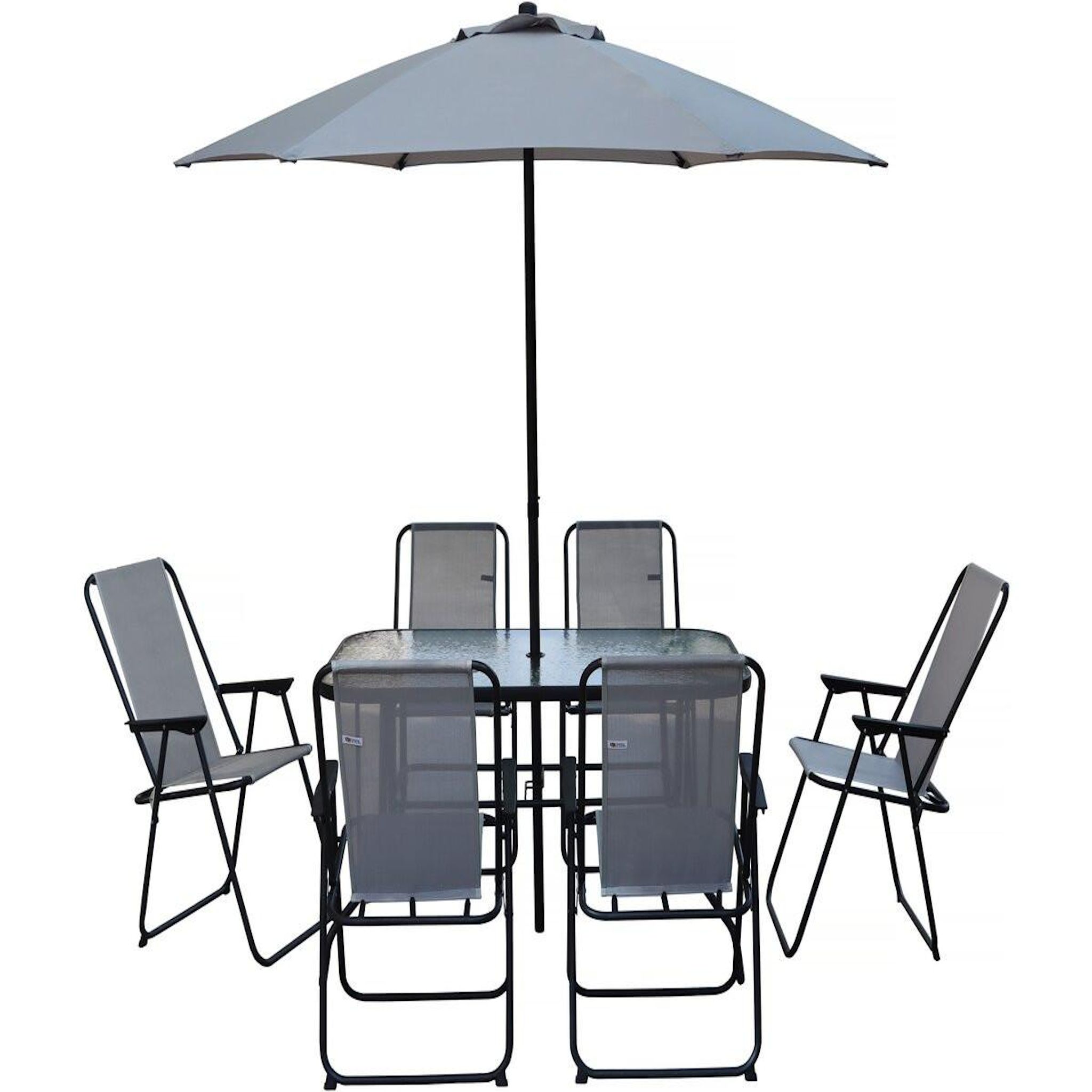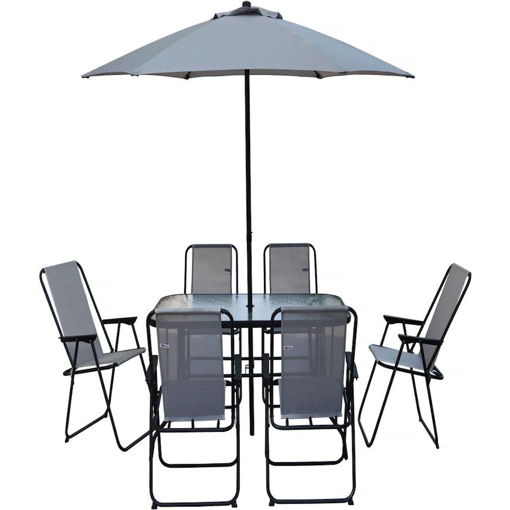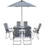 Ensemble table et chaises + parasol Convivia - 6 places - Dimensions chaises : 53 x 67 x 89 cm - Dimensions parasol : 180 x 180 x 220 cm - Dimensions table : 130 x 80 x 70 cm - Métal - Table avec verre trempé - Gris clair.
