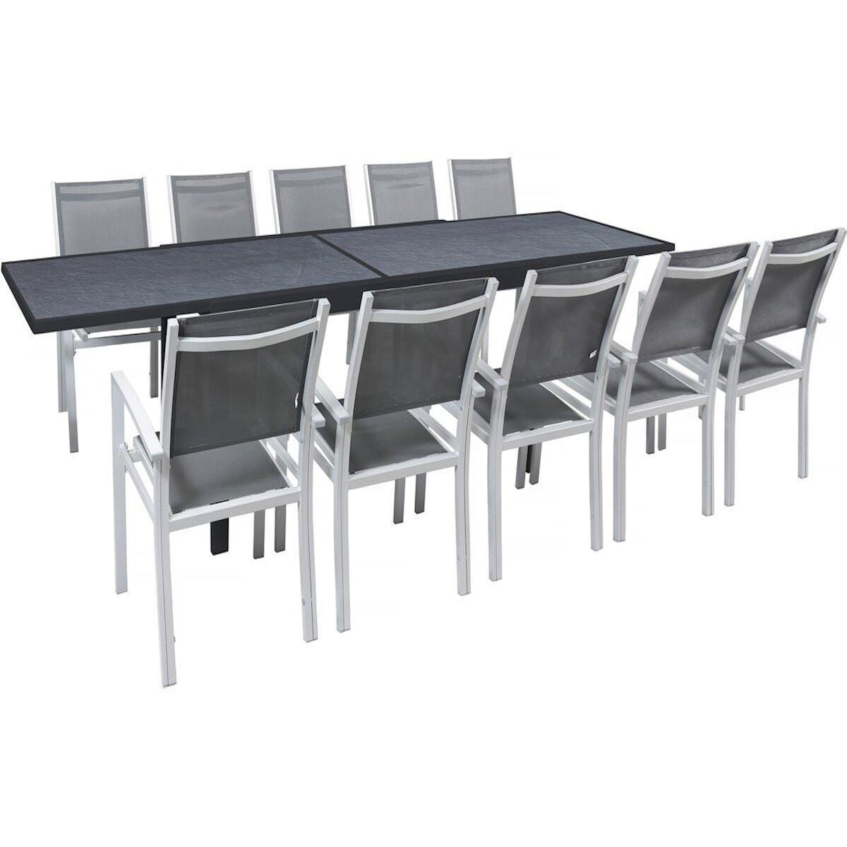 Ensemble table et chaises d'extérieur Lagos - Dimensions table : 200/320 x 105 x 76 cm - Fonction extensible - Effet marbre - Traitement anti-UV et anti rouille - Aluminium - 10 chaises - Dimensions chaises : 57.5 x 62 x 90 cm - Gris foncé.