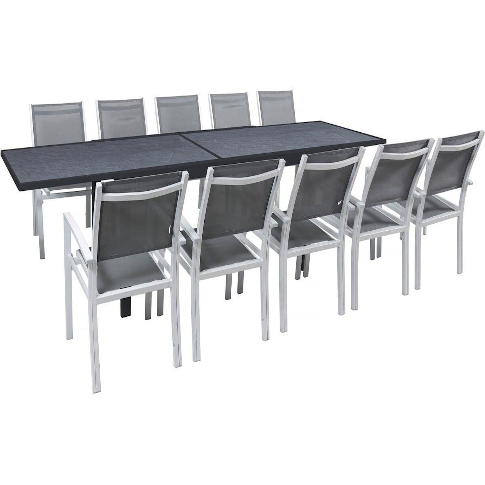 Ensemble table et chaises d'extérieur Lagos - Dimensions table : 200/320 x 105 x 76 cm - Fonction extensible - Effet marbre - Traitement anti-UV et anti rouille - Aluminium - 10 chaises - Dimensions chaises : 57.5 x 62 x 90 cm - Gris foncé.Salon de jardin Lagos - 200/320 x 105 x 76 cm - 10 chais