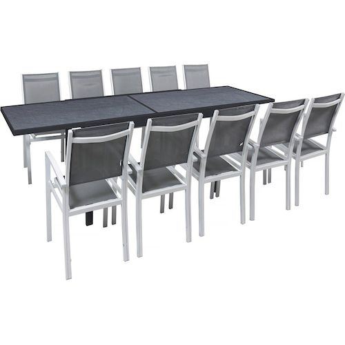 Salon de jardin Lagos - 200/320 x 105 x 76 cm - 10 chaises -Gris foncéLe salon de jardin Lagos est l'allié parfait pour des repas conviviaux en famille ou entre amis. Conçu pour offrir à la fois praticité et durabilité, cet ensemble s'adapte à toutes vos envies grâce à sa table extensible et ses 10 chaises confortables.Sa structure en aluminium, à la fois robuste et légère, assure une excellente durabilité en extérieur. Grâce à son mécanisme extensible, la table passe de 200 à 320 cm, offrant un espace généreux pour recevoir vos invités en toute convivialité. Son design épuré s'adaptent à tous les styles d'aménagement.Avec leurs dimensions généreuses, 57.5 x 62 x 90 cm, les chaises allient confort et solidité. Conçus pour résister aux UV, à la rouille et aux intempéries, elles assurent une longue tenue dans le temps. Avec le salon de jardin Lagos , transformez votre terrasse ou jardin en un espace chaleureux et raffiné, prêt à accueillir tous vos moments de partage. Ensemble table et chaises d'extérieur Lagos - Dimensions table : 200/320 x 105 x 76 cm - Fonction extensible - Effet marbre - Traitement anti-UV et anti rouille - Aluminium - 10 chaises - Dimensions chaises : 57.5 x 62 x 90 cm - Gris foncé .Caractéristique couleur: Salon d'extérieur Lagos - Dimensions table : 200/320 x 105 x 76 cm - Fonction extensible - Effet marbre - Traitement anti-UV et anti rouille - Aluminium - 10 chaises - Dimensions chaises : 57.5 x 62 x 90 cm - Non empilable - Gris foncé