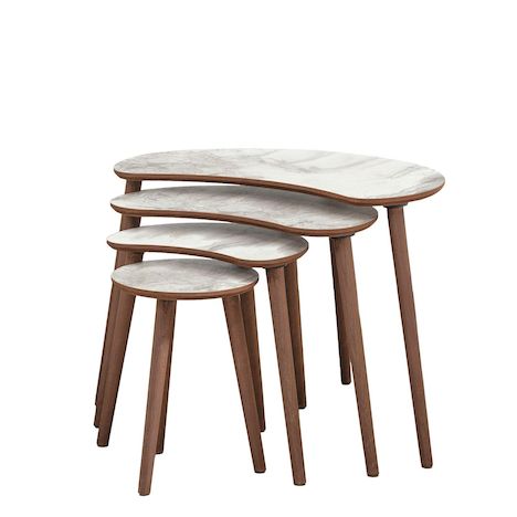 Ensemble de tables gigognes modernes (4 pièces), finition marbre blanc, 100 % MDF, pieds en bois. Grande table : 40 x 55 x 75 cm, Grande table : 33 x 50 x 59 cm, Table moyenne : 27 x 45 x 43 cm, Petite table : 30 x 40 x 30 cm. Élégantes et fonctionnelles,.Table gigogne (4 pièces) en bois Moon Donne