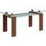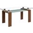 Descriptif : Table repas Eva moderne et esthétique - Plateau supérieur en verre trempé transparent et résistant - Pieds en MDF coloris marron laqué - Dimensions : 150 x 80 x 75 cm - Pour une capacité idéale de 6 convives.