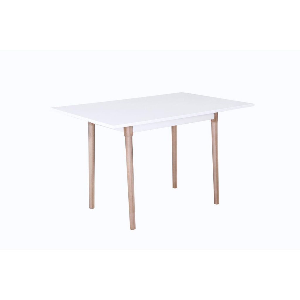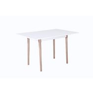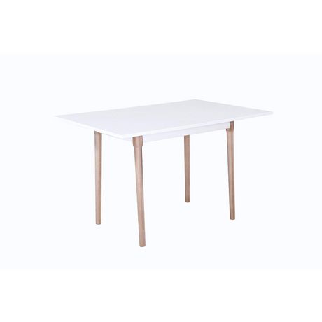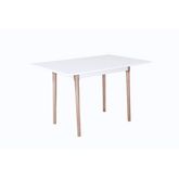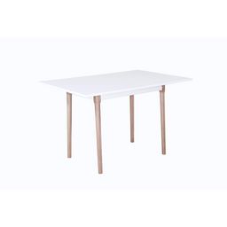 Table de repas Freddy - Couleur : blanc - Plateau en MDF laqué blanc - Dimensions : 120 x 80 x 75 cm - Piétement en bois de forme conique - Design scandinave.