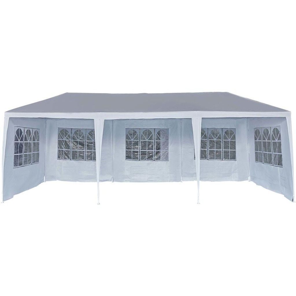 Tente de réception Carolina 9 - 24.39 m² - Dimensions extérieures : 8.56 x 2.85 x 2.6 m - Dimensions intérieures : 8.56 x 2.85 x 1.98 m - Blanc - Structure : acier - Matière : polyéthylène (toit, panneaux, fenêtres) - Densité de la toile : 90 g/m² - 2 portes (dimensions : 285 x 195 cm) - 6 fenêtres transparentes (dimensions : 176 x 102 cm) - Résistant à l'eau - Anti-rouille.