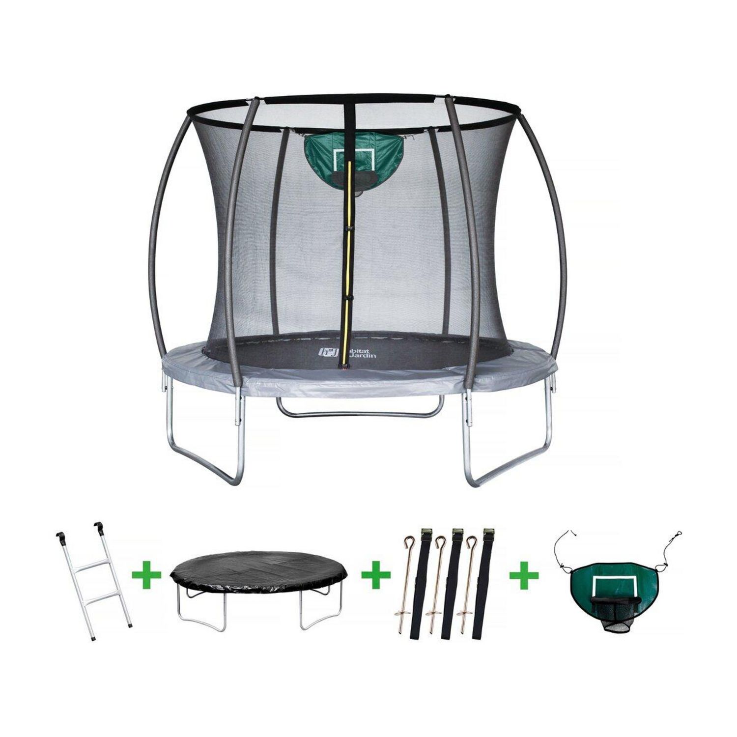 Trampoline avec filet intérieur Jumper Ø2,44 m - Gris - Avec housse de pluie, échelle, couverture et kit d'ancrage - Panier de basket-ball - Age minimum : plus de 3 ans - Ressorts : 48 pièces - Tapis de saut : résistant aux UV.Trampoline avec filet intérieur Jumper Ø2,44 m - Gris Notre trampoli