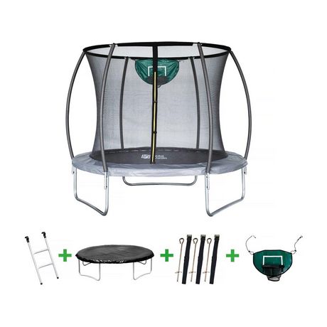 En savoir +Trampoline avec filet intérieur Jumper Ø2,44 m - Gris - Avec housse de pluie, échelle, couverture et kit d'ancrage - Panier de basket-ball - Age minimum : plus de 3 ans - Ressorts : 48 pièces - Tapis de saut : résistant aux UV.