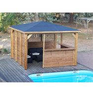 Cet abri de piscine donnera un véritable coup de cachet à votre extérieur et vous permettra de profiter de vos espaces extérieurs. Abri en bord de piscine ou salon extérieur couvert : cet abri de jardin en bois massif de 14,36 m² est adaptable en fonction de votre jardin et surtout de vos envies. Cet abri de jardin à une paroi à ventelles en partie haute, une paroi avec mur plein et deux parois avec comptoirs vous permettra de profiter de votre jardin sous toute météo. Sapin massif traité sous très haute température, cet abri de jardin s'inscrira dans le temps et nécessitera que peu d'entretien.